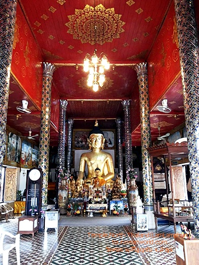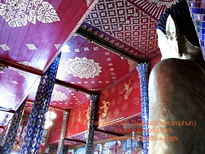 The image sits on top of a beautifully carved, gilded and lacquered canopy. Every year on Visakha Bucha Day, a ceremony will be held for worshipers to sprinkle water onto Phrathat Hariphunchai.